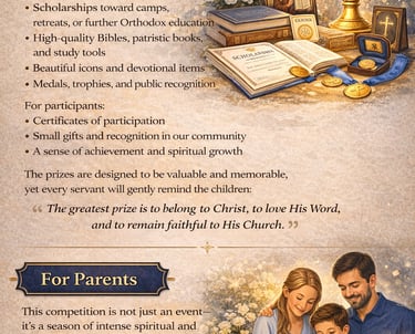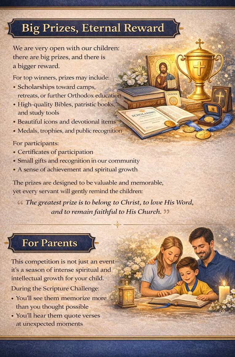The Theotokos Scripture Challenge is our Bible competition designed to turn Scripture study into a joyful, high-energy journey. Children and teens don’t just study quietly—they train, compete, and celebrate around the Word of God.