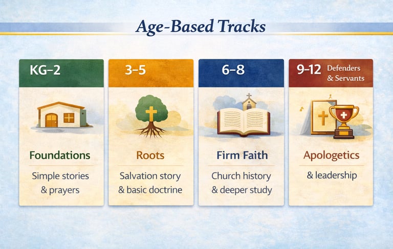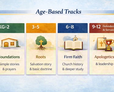 9–12: Defenders & Servants—In-depth Bible study, apologetics, and preparation to teach others.